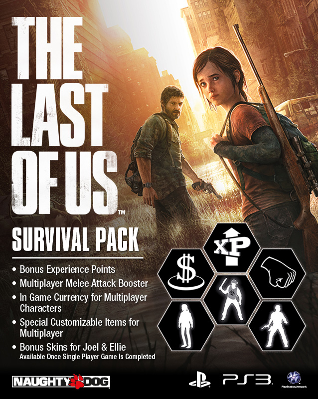 If you pre-order at GameStop, you’ll get the “Survival Pack” in addition to the “Sights and Sound Pack.” This includes bonus multiplayer experience points, a multiplayer melee attack boost, extra in-game starting cash, special customizable multiplayer character items, and two special bonus skins for Joel and Ellie unlocked after you complete the single-player campaign.