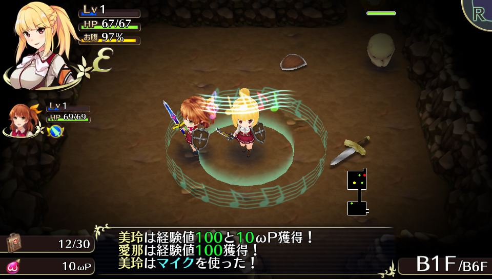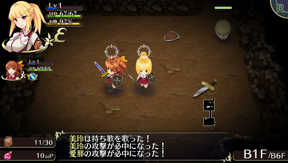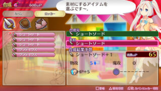 You can strengthen the equipment you obtain in dungeons by consuming Omega Power. Weapons, shields, underwear can all be synthesized within their own categories (and somehow, panties and bras can be merged to create something new). You can also synthesize in the dungeon itself. If you synthesize two items of the same kind, you’ll get a more powerful version (in attack and defense) of that item. For example, synthesize two Short Swords to get a Short Sword +1. If you synthesize two completely different items, it’s possible the item will inherit additional effects such as the ability to inflict the enemy with status ailments. Certain combinations will result in completely new equipment.