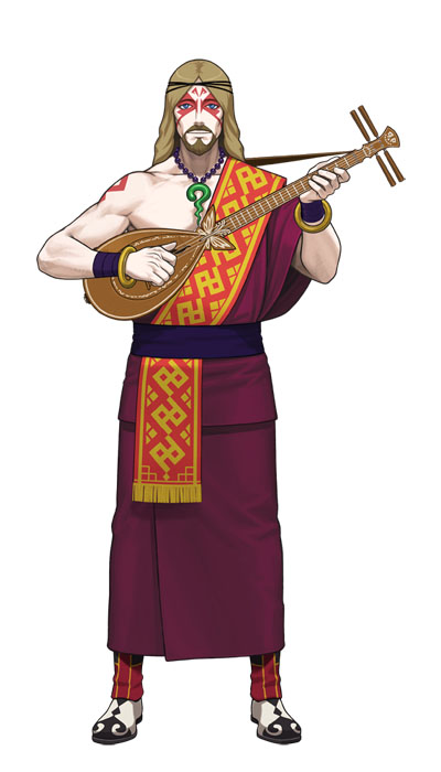 A devout follower of the Kurain faith and chief priest of the Jiin Temple. He calls his “damaran,” an instrument of the Kurain people, his partner, and performs the musical accompaniment to Leifa’s Dedication Dances.