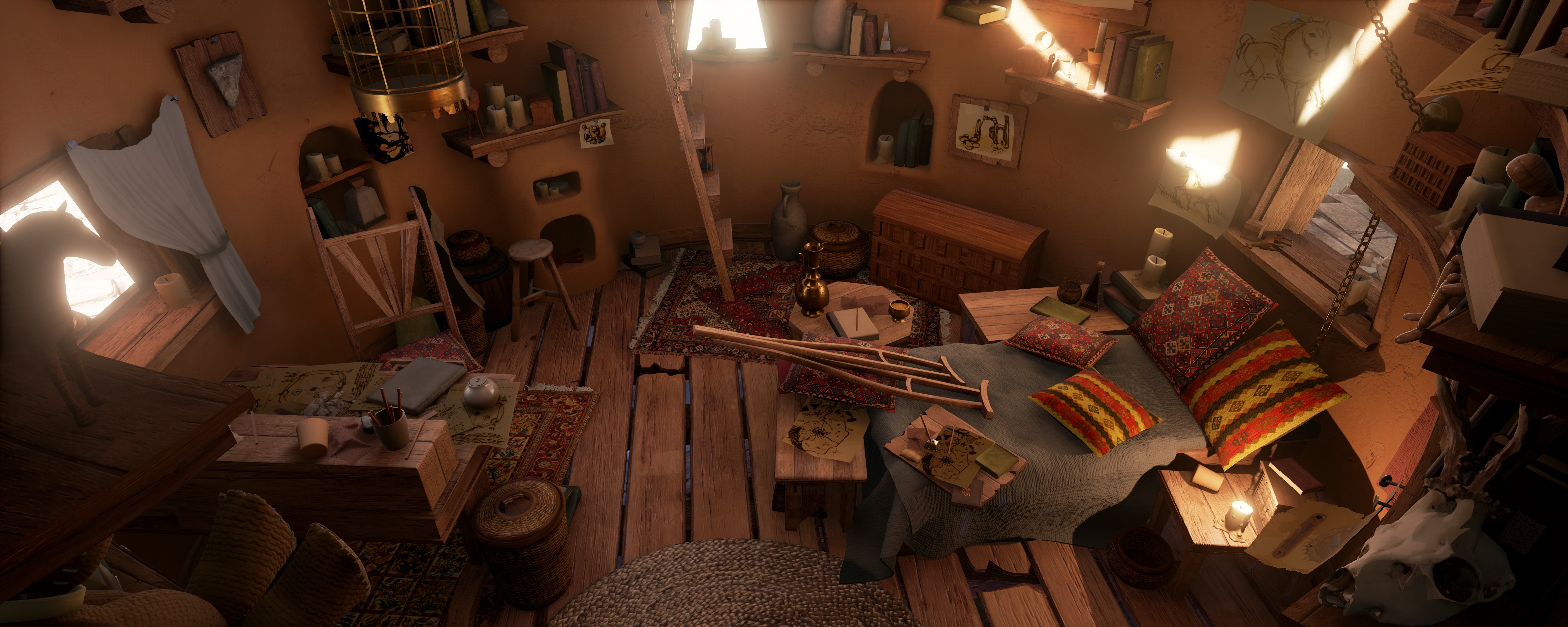 The girl stays in bed, in a small hut. Her crutches are laid out in front of her on the bed. Players can look around inside the hut, and do things such as lean over to look over the edge of the bed.