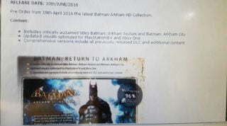 According to the images provided to Eurogamer, the Batman: Arkham HD Collection will be released for PlayStation 4 and Xbox One on June 10 in Europe, and include both Batman: Arkham Asylum and Batman: Arkham City with updated visuals, as well as all previously released downloadable content and add-ons.