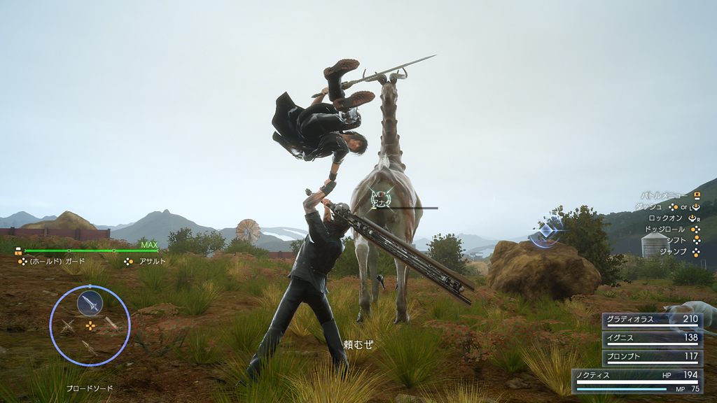 Gladio swings his body while wielding a large sword and sweeps away the surrounding enemies. A followup attack from Noctis can be triggered with successful additional input.
