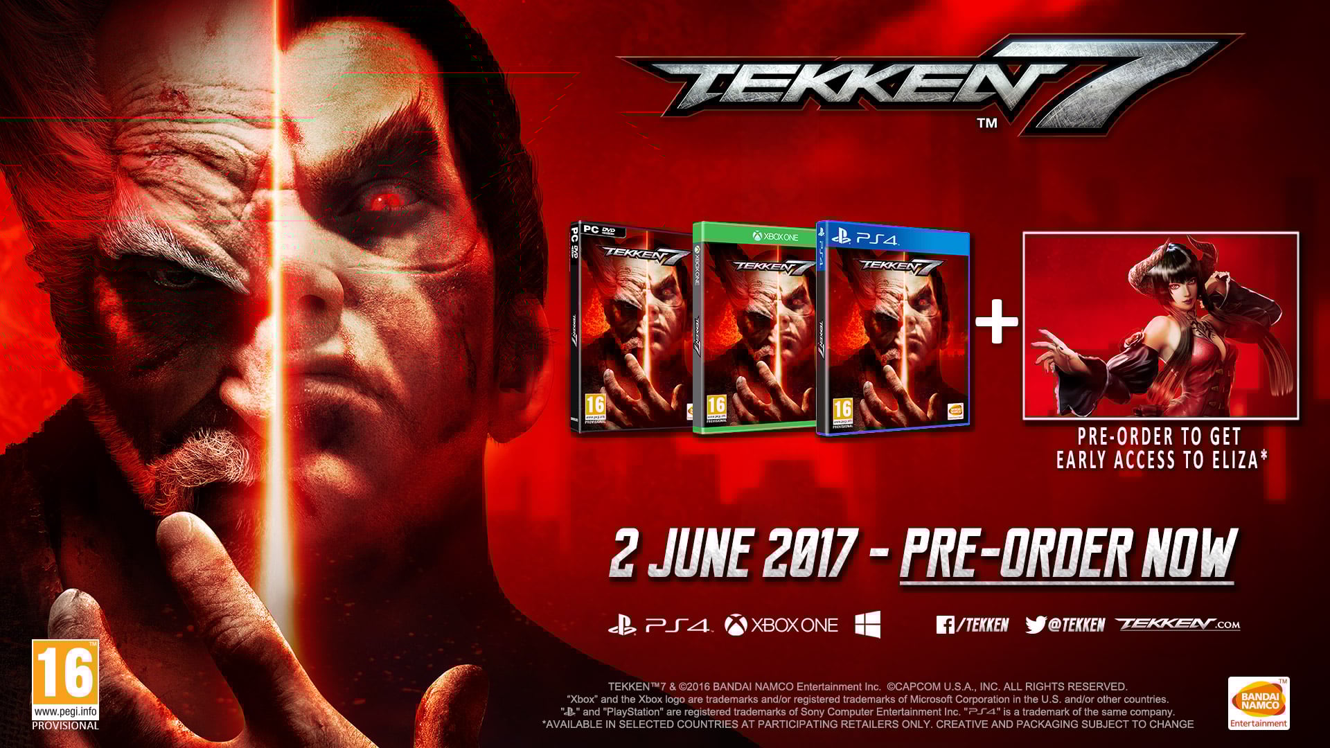 Tekken 7 will launch worldwide for PlayStation 4, Xbox One, and PC on June 2, Bandai Namco announced. In Japan, the PlayStation 4 and Xbox One versions will launch a day earlier on June 1.