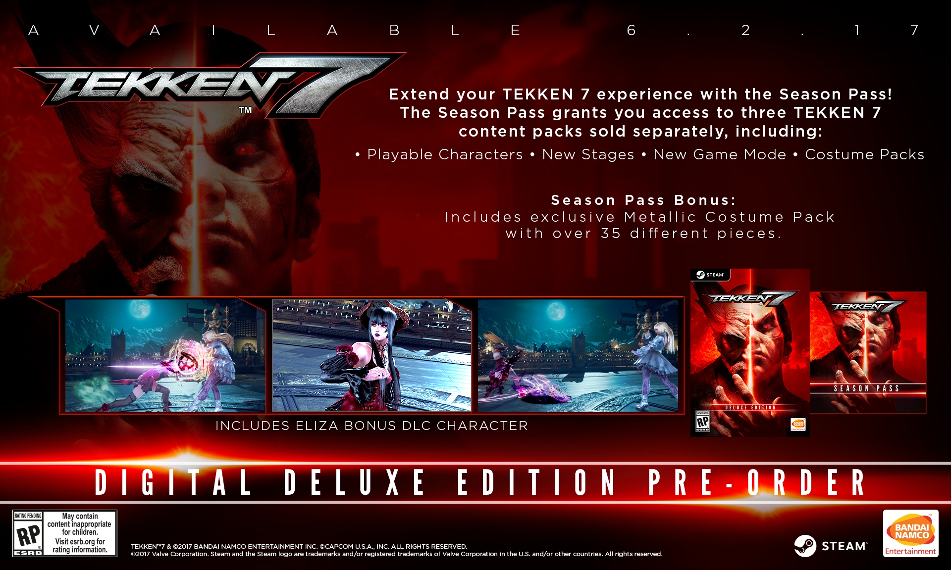 - A Tekken 7 Season Pass (available for PlayStation 4, Xbox One, Steam) will grant players access to three content packs aimed to extend the Tekken 7 experience and will include new playable characters, new stages, a new game mode, costume packs, and a bonus 35-piece Metallic Costume Pack. *Each DLC pack contained within the Tekken 7 Season Pass may also be purchased separately.