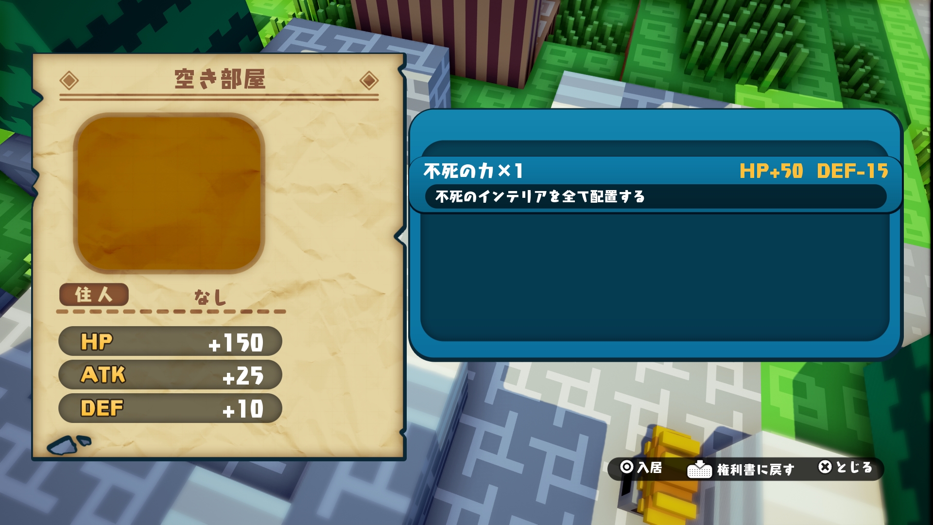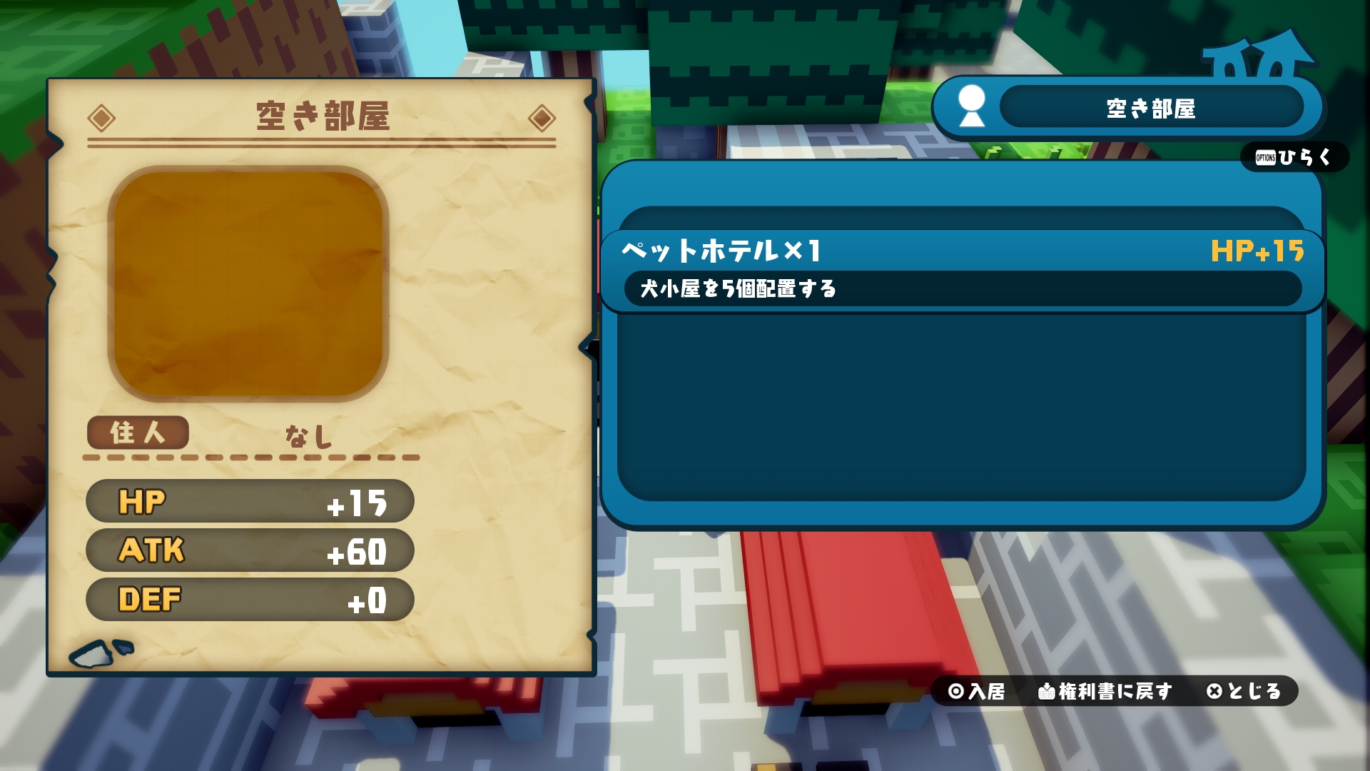 —Placing five dog houses triggers the housing effect “Pet Hotel,” which adds an “HP +15” stat revision that does not occur in simple placement.