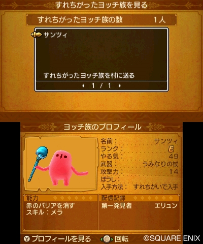 In the 3DS version of Dragon Quest XI, there is a village where a special tribe among the Incarnations of Time known as the “Yocchi” live, and where you can make use of the system’s StreetPass feature. You can also discover a dungeon that only the Yocchi can enter called the “Labyrinth Beyond Time,” where you can send in the Yocchi you gathered through StreetPass to explore. Exploring the Labyrinth Beyond Time may open the door to even more surprising amusements.