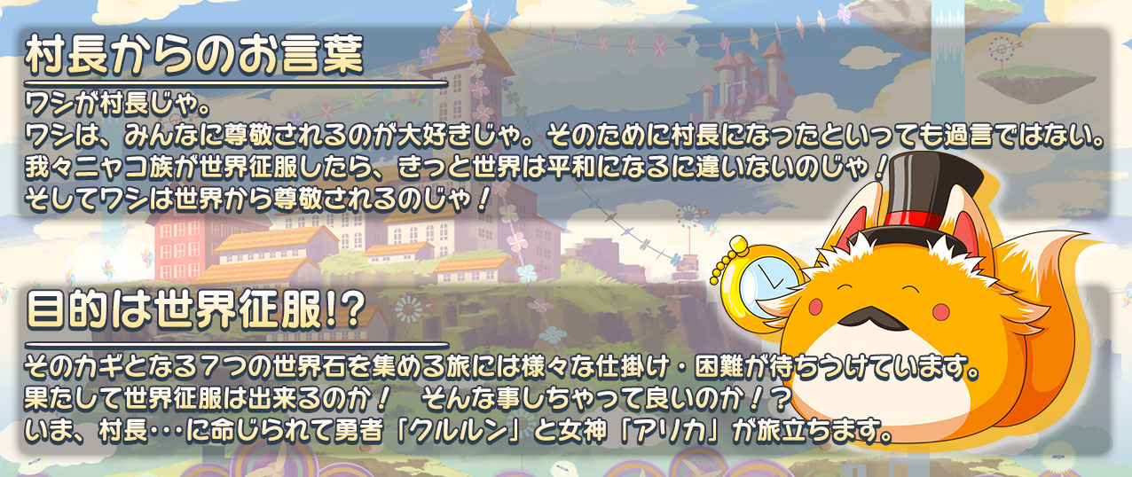 The head of the Katz village, who has his sights set on world domination. He has chosen Kulu as the brave adventurer to gather the world stones. He yearns to be respected by everyone and most recently had a stone statue of himself erected in the village.