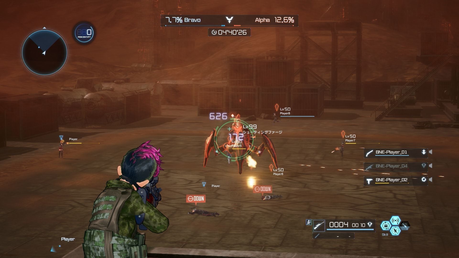 Online Battle – Up to eight players are divided into Alpha and Bravo teams and compete to cause the most damage to a boss character that populate the map. Threats come from all angles as players manage their time damaging boss character while also denying the other team from scoring points.