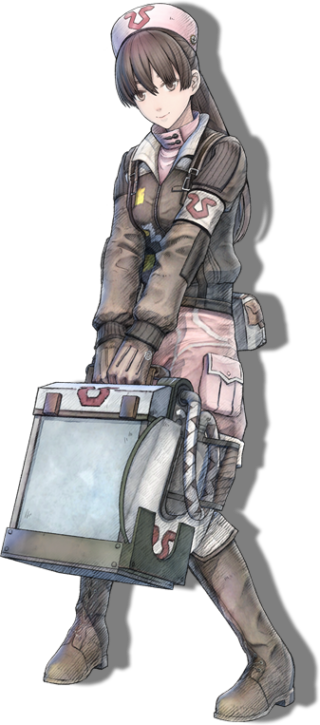 Edinburgh Army 101st Division No. 1 Battle Brigade No. 32 Armored Ranger Battalion Squad E medical officer and corporal. Quiet and kind, she’s popular among the troops for her soothing smile. Since she grew up in an all-male household, she is particularly skilled in the treatment of men, and patches up the injuries that come her way with a smiling face. She hopes to go to medical school, but is volunteering to serve in the military in order to help her family.