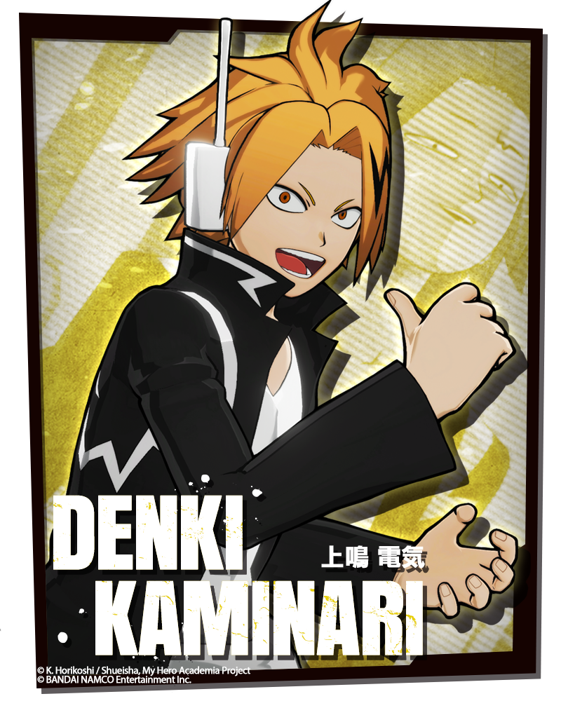 - Denki Kaminari’s Quirk allows him to channel electricity from his body and shoot it. He cares for his allies deeply and is often afraid of hurting them with his electrical powers. Once he knows they are safe, he can unleash his true powers using his special move “Indiscriminate Discharge 1,300,000 volts”.