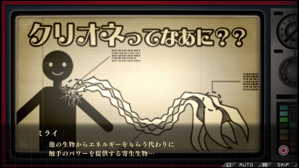 The creatures that wander around the ruins have tentacle-like things growing from their bodies, which are separate beings known as “clione.” Clione are parasites that leech onto living things and offer their tentacle powers to their host in exchange for the host’s energy. As you progress through the game and strengthen the functionalities of the Extend Machine, the main characters will also be able to implant clione onto their bodies and use their power.