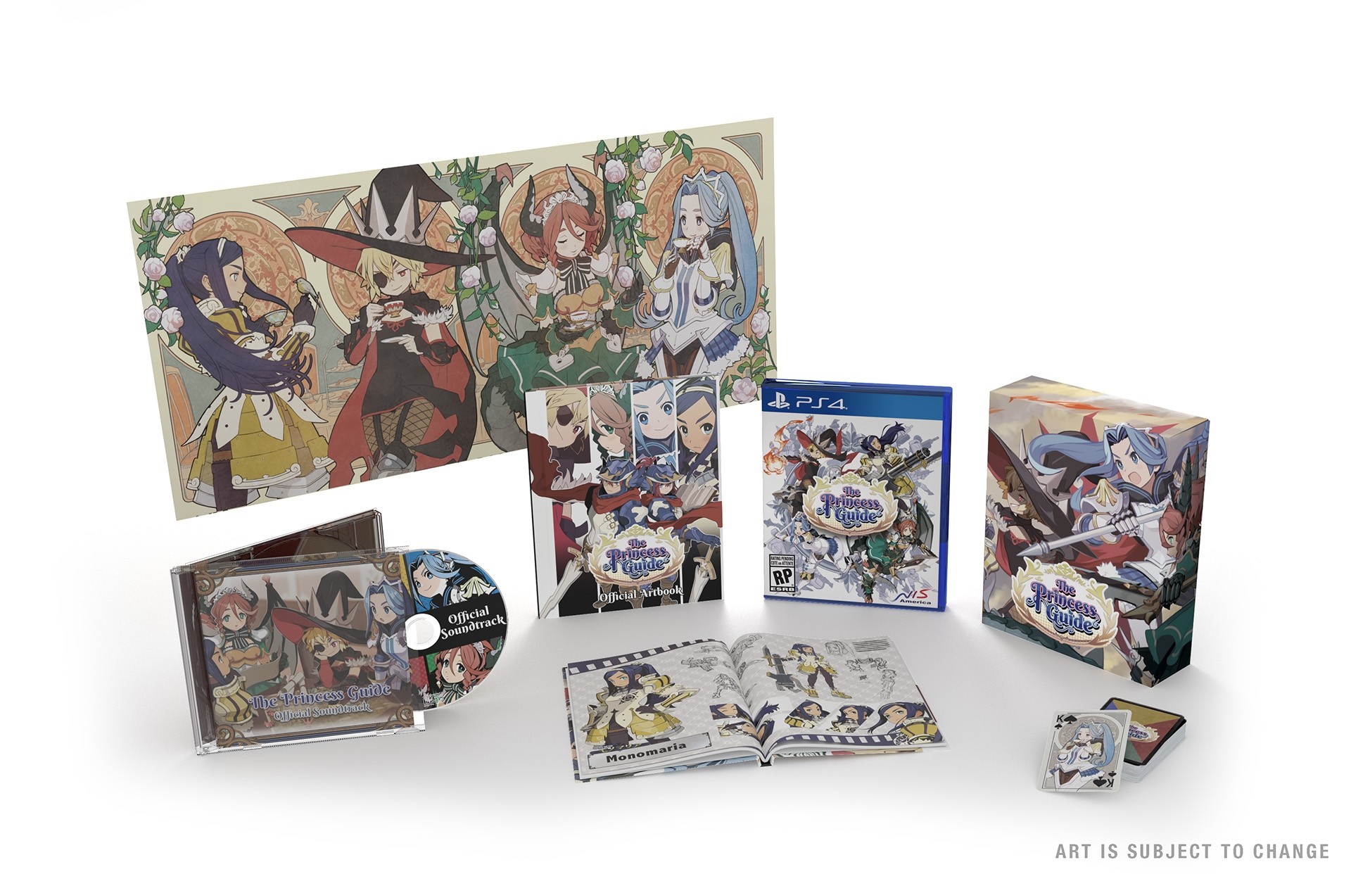 A $59.99 limited edition including a copy of the game, official soundtrack, official hardcover art book, “Four Knights” playing cards, “Glory of the Princess Knights!” tear-resistant poster, and collector’s box is currently available for pre-order on the NIS America Online Store (PS4, Switch).