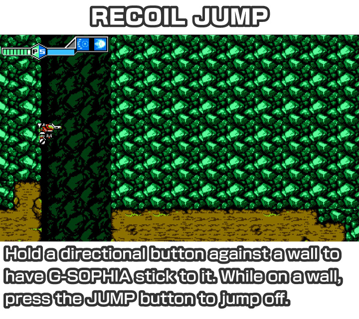 - G-SOPHIA’s Gaea System is the key to maximum mutant blasting efficiency! The Gaea System converts the energy created by the impact of falling from tall heights or taking damage, then turns that energy into SP. By making good use of the terrain, more and more SP can be recovered, allowing Jason to use more of G-SOPHIA’s sub-weapons. Mastering the Gaia System brings out G-SOPHIA’s full potential, allowing players to traverse stages in an ultra-satisfying way.