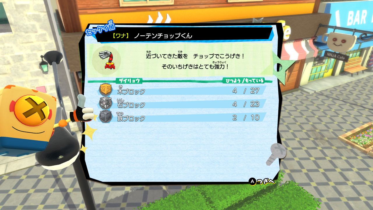 In town, the outrageous ninjas lurk and various materials for parts can be obtained. In order to create your very own “secret base,” your adventure will leave the village and expand over the town.