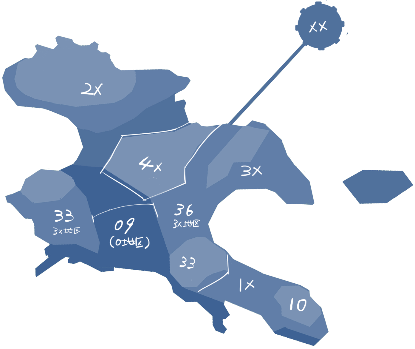 Each zone is designated by a two-digit number. The first digit tells you which district it’s a part of, and the second digit is the zone’s number within that district. For example, Zone 36 is the sixth zone established in District Three. The Ark is made up of five regular districts, from 0x to 4x, plus one special district that you might have noticed at the top right of the map. You’ll learn more about that one later…