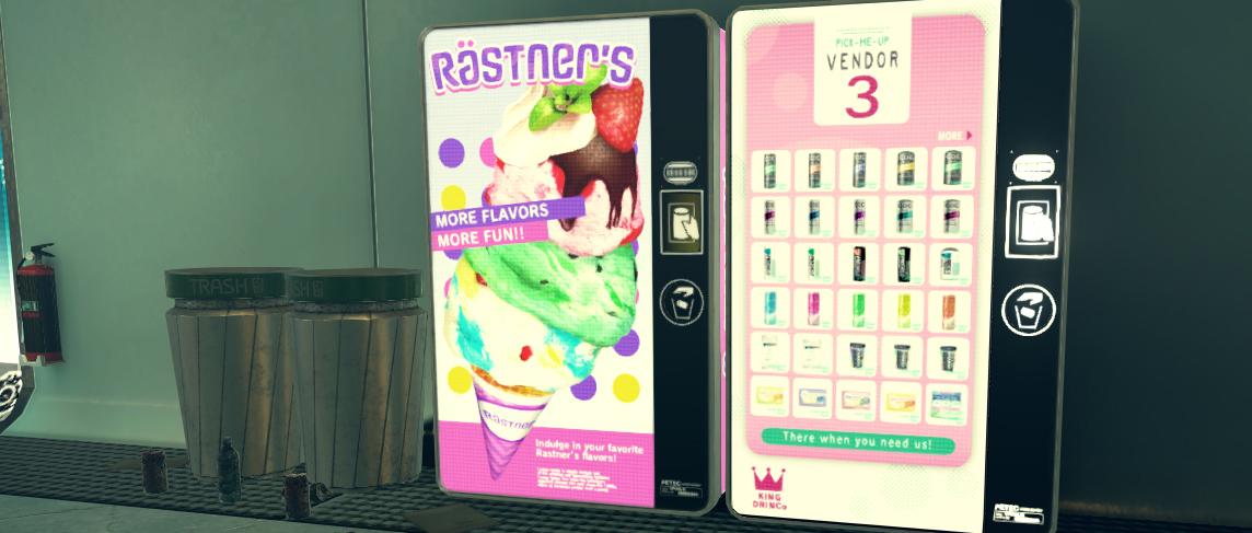 The ultra-advanced Vendor-3 units aren’t your ordinary vending machines! They’re loaded up with an advanced AI that allows them to make small talk with customers. Some of the Vendor-3 machines you’ll encounter have had a few unique tweaks made to their personality routines, so if you see a new one, don’t forget to say hi. Pick up a tasty beverage while you’re at it!