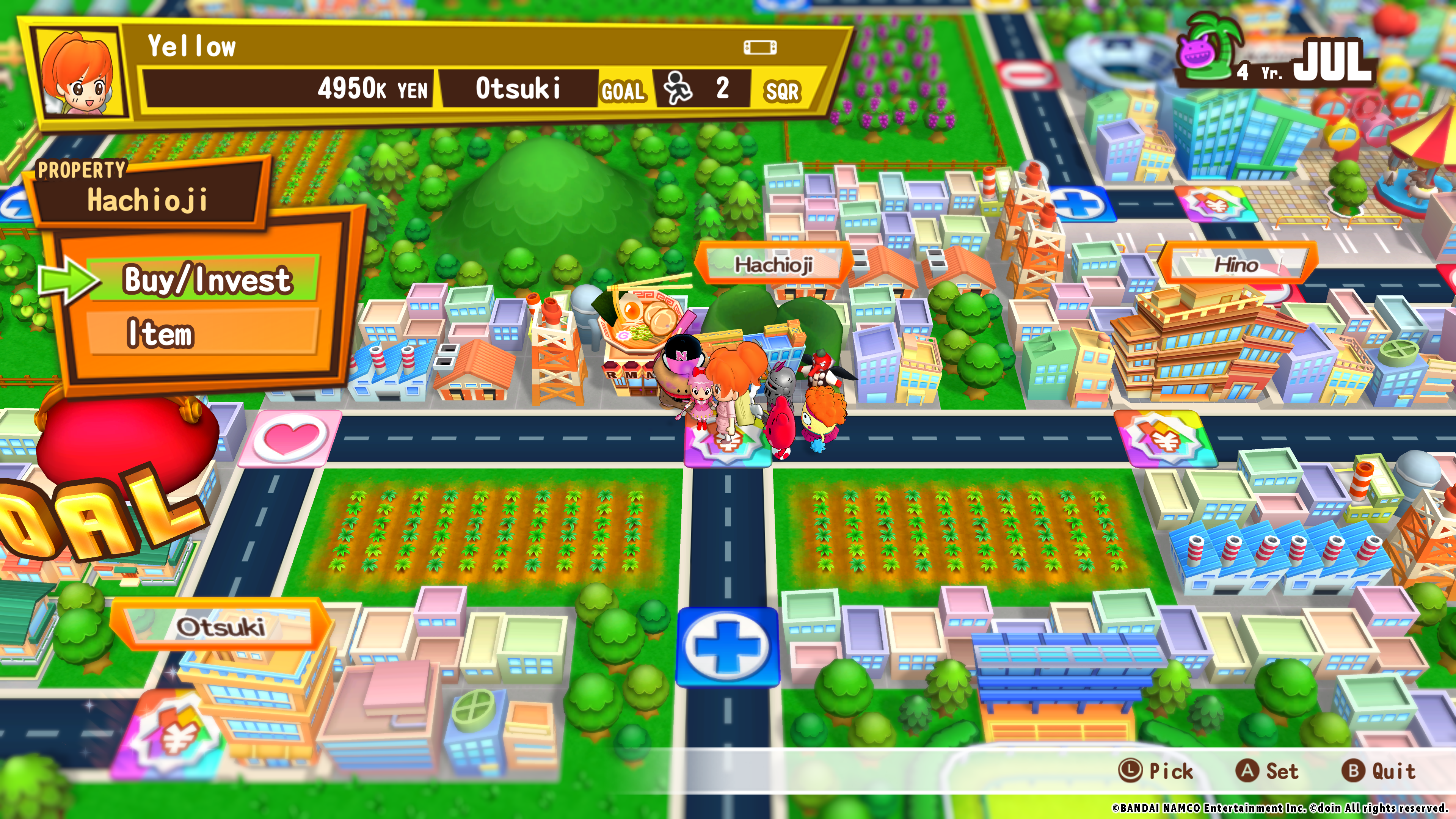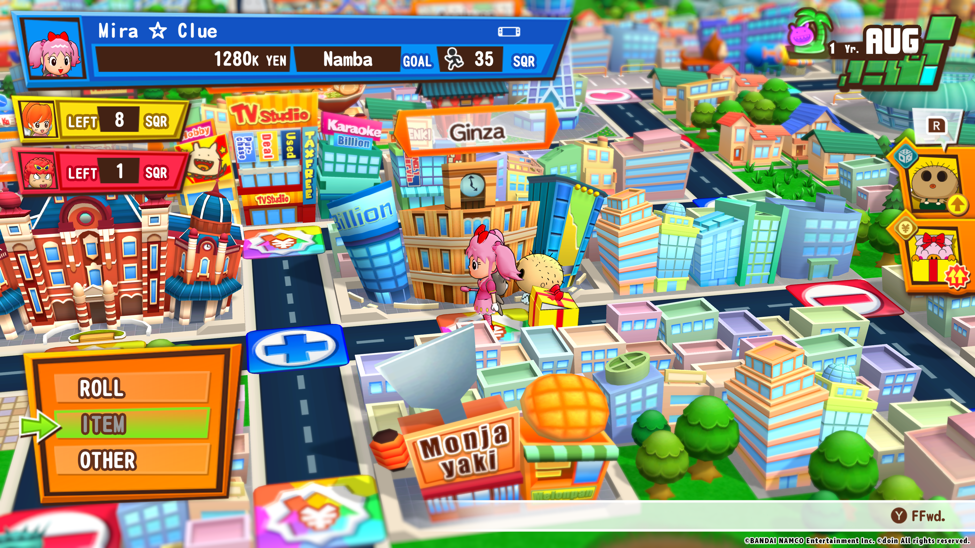 The core objective in Billion Road is pretty straightforward—travel all across Japan and earn more money than anyone else. You earn money by landing on property squares with investment opportunities, like a sushi restaurant in Ginza or an animation goods store in Akihabara. After you invest, you’ll have to wait until March rolls around for those investments to pay off. In the meantime, be on the lookout for errant monsters that may shower you with riches…or throw a wrench in your plans! You can also earn extra money by landing on item squares, which can either help you reach your own goals or simply ruin your rivals’ plans. If you finish the game with the most money…you win!