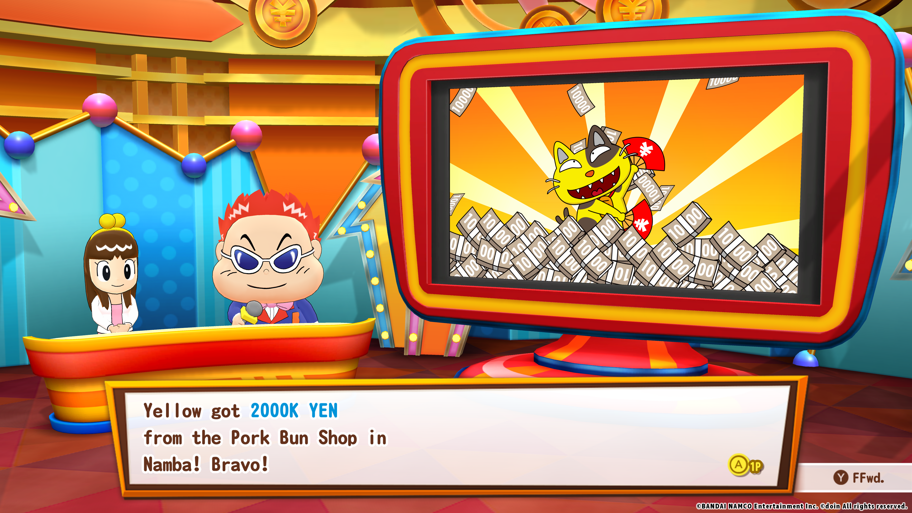 The object of Billion Road is to earn money while winding along a railway path in Japan. Money is earned by landing on a plus labeled square or landing on a property square with investment properties, such as a sushi restaurant in Ginza, Tokyo or an Animation shop in Akihabara and investing in these properties. In order to collect money from your investment properties, you must progress the game until the end of March when you earn property income. The amount of $$$ earned depends on the income percentage rate of your investment properties. There’s an additional incentive to use critical thinking and investment skills. Extra money can be earned if you land on a “Item” square and earn items that can either help you attain your goals or items that can ruin your rivals (for example, a location shuffle item can teleport everyone to a random location on the map). As you may have suspected, the player with the most money at the end of the term wins the game.