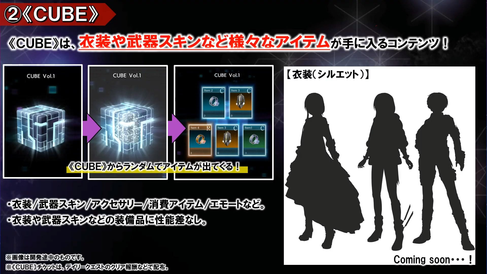 CUBEs allow you to obtain various items, including costumes, weapon skins, accessories, consumable items, and emotes. The items that CUBEs contain are random. Items such as costumes and weapon skins do not affect their actual performance.
