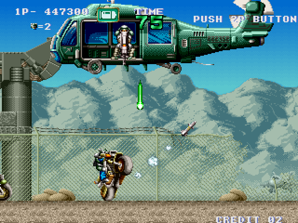 Featuring enhanced animations, improved gameplay, and a killer soundtrack, GunForce II was created by the same staff that later developed the iconic Metal Slug series. It is considered the spiritual predecessor to the Metal Slug series, with many of its sound effects and designs being reused in the series. It is a must-play for all fans! Set in a futuristic post-apocalyptic environment, the game allows you to take control of Max or Lei. Your goal is simple: dual blast your way through five different stages and rack up those high scores! Vehicles make a return, as is tradition, including motorbikes, mechs, and tanks, to name a few.