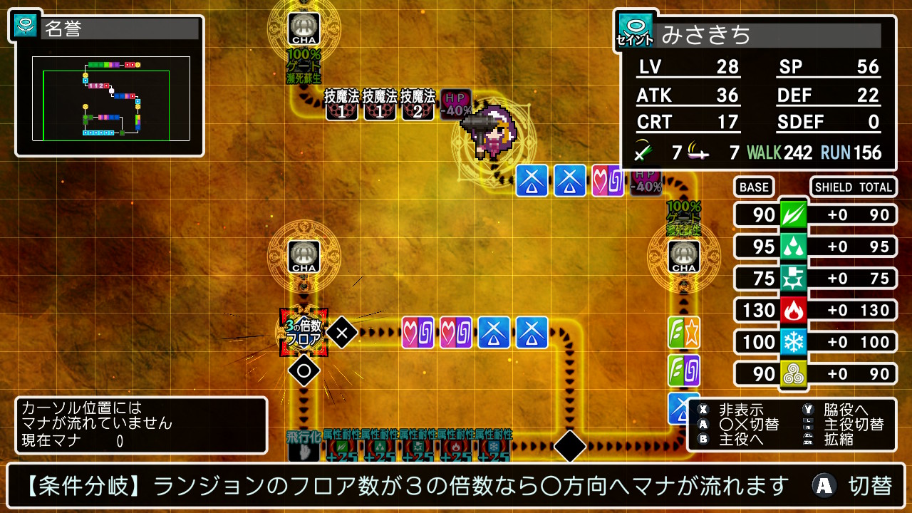 By positioning the main character and supporting characters within a Magic Circle, the supporting characters’ power, known as “Mana,” flows toward the main character. The main character’s abilities are enhanced by placing and activating magical items called “Artifacts,” which provide various enhancement effects on the spaces where Mana flows.