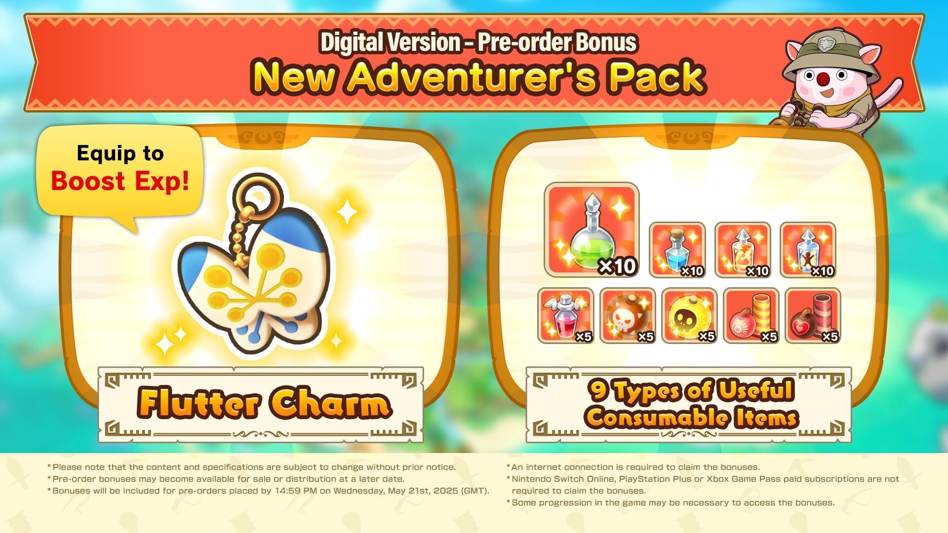 - Pre-Order Bonus: “Adventurer’s Pack” – This special bundle includes the Flutter Charm, an accessory that boosts your experience gains, plus nine types of useful consumable items to help you on your journey!