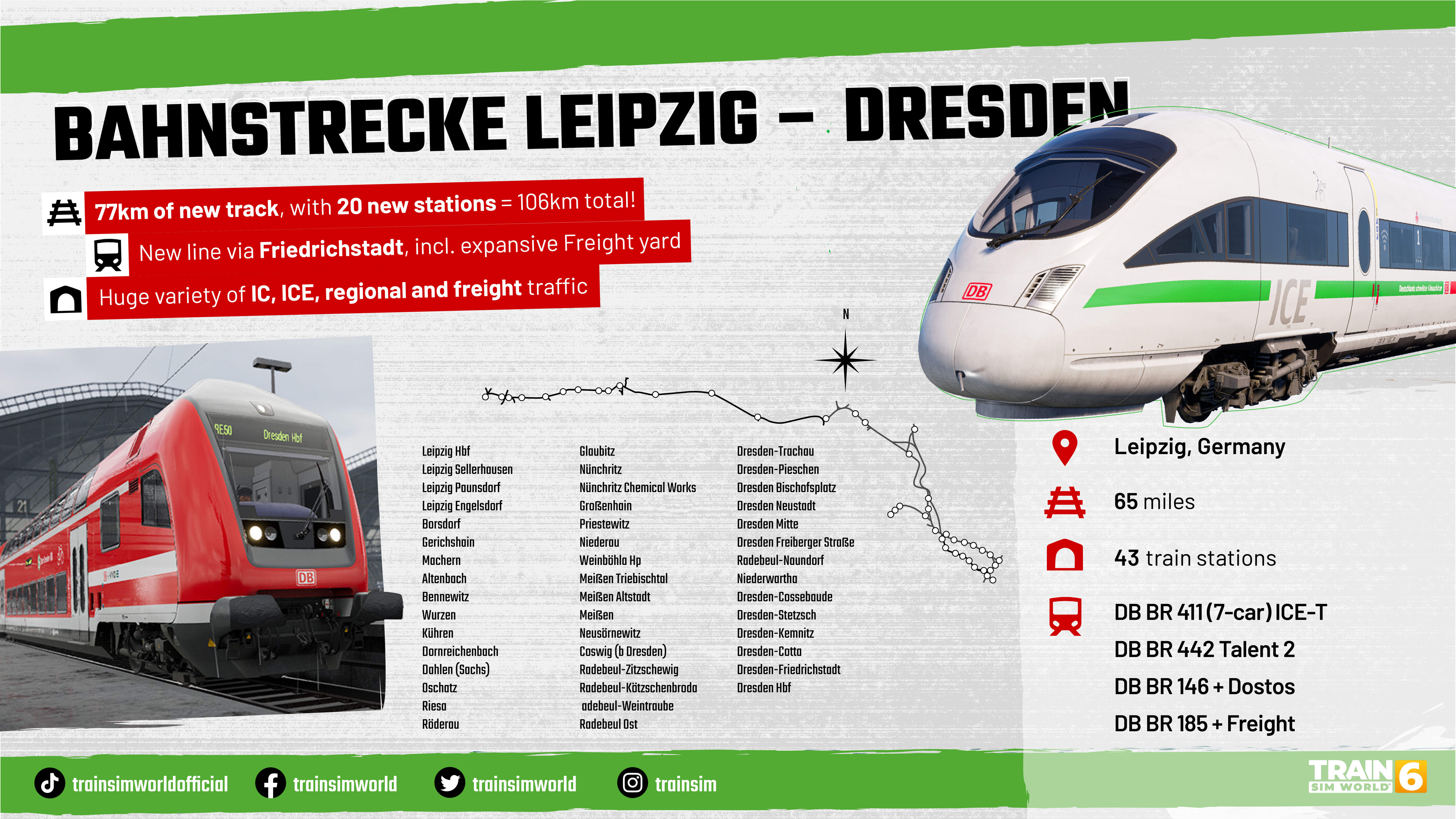Go beyond the boundaries of Nahverkehr Dresden and accelerate westbound all the way to Leipzig in Bahnstrecke Leipzig – Dresden. Drive modern ICE-T, BR 442, and loco-hauled passenger trains, as well as freight, along the oldest long-distance railway in Germany.