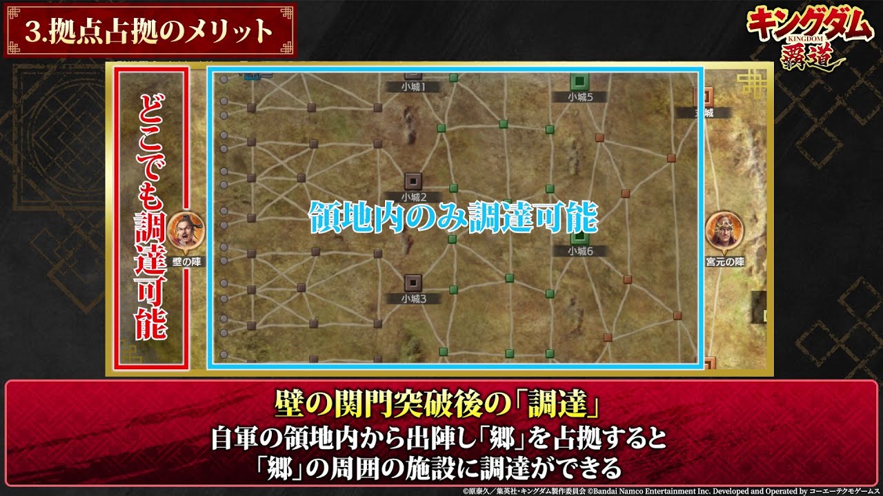 - The Vast World of Kingdom at Overwhelming Scale – From Dakan Plains to Hangu Pass, the various battlefields featured in the anime have been recreated as 3D maps. Work together with players from the same army and strategize to advance towards castles and fortresses.