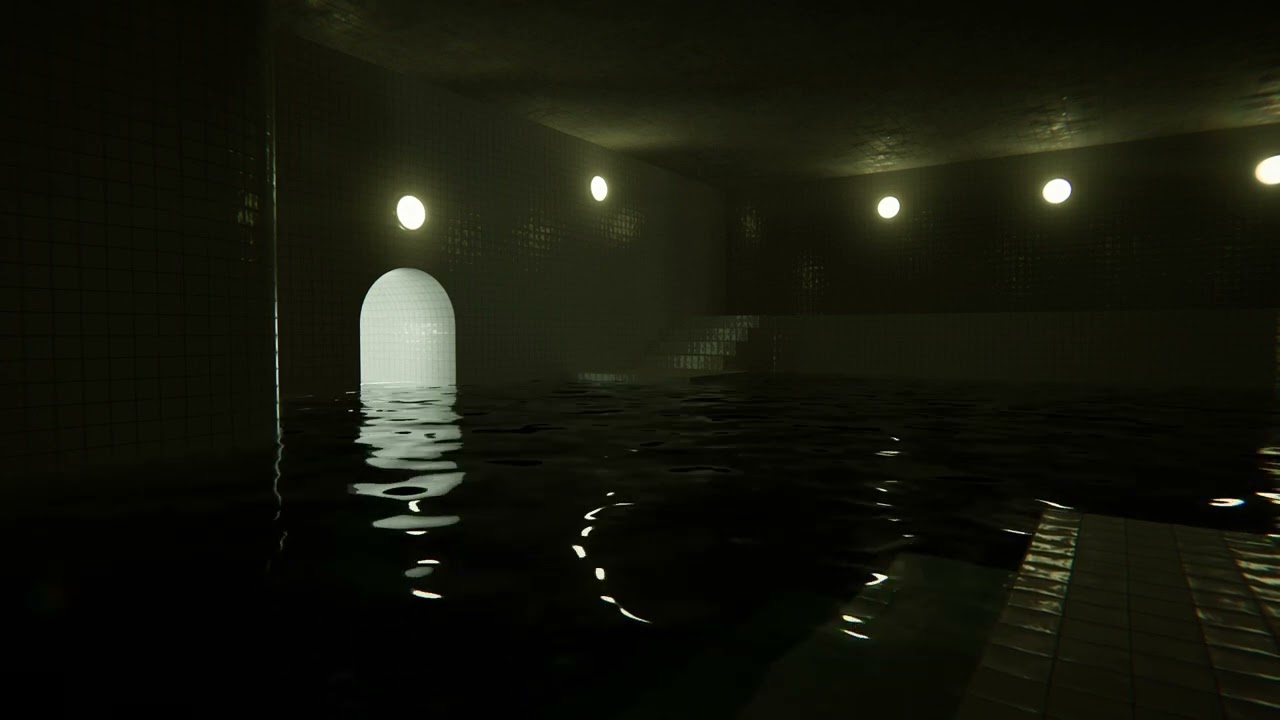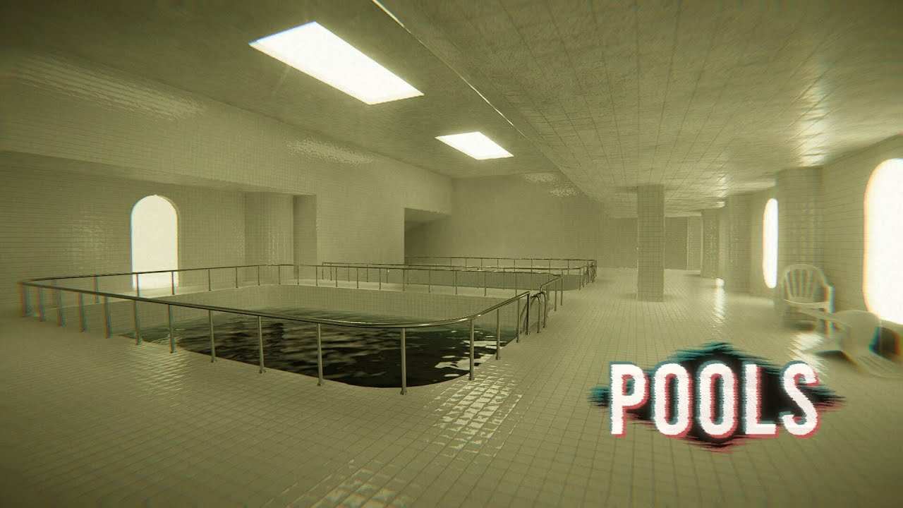 POOLS is inspired by a internet phenomenons “liminal spaces,” “found footage,” and “backrooms”—specifically “backrooms pools” or “poolrooms.”