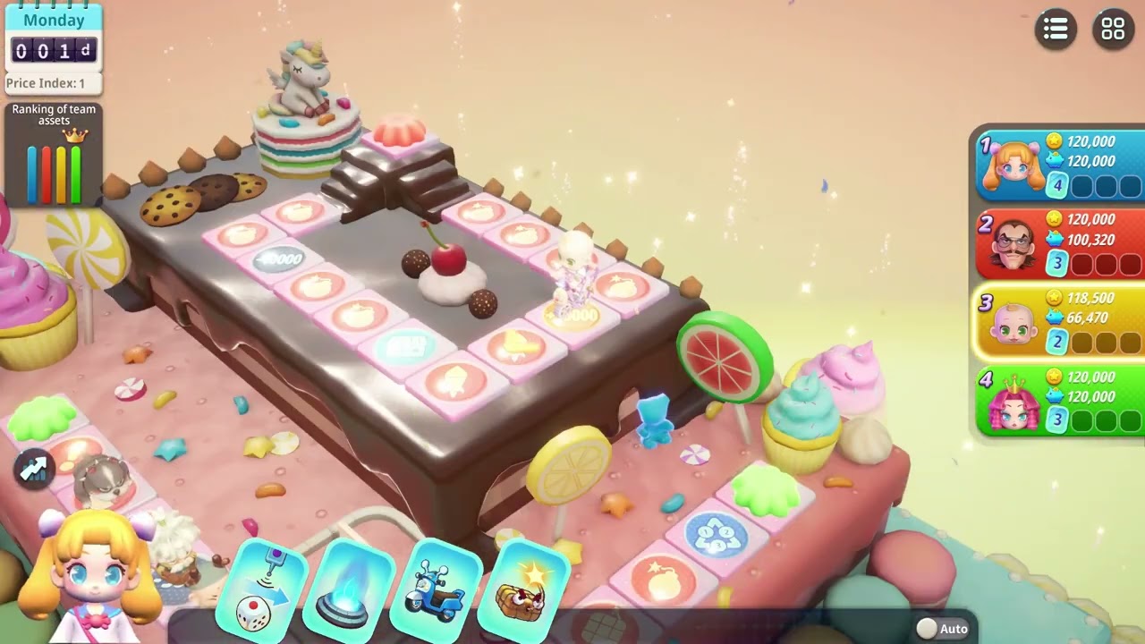 Buy empty land, build houses or chain stores on it, receive rentals from players who pass by. Buy properties as many as possible, and level up the buildings hard for large amount of rentals. When in group play, the properties could be leveled up by teammates.