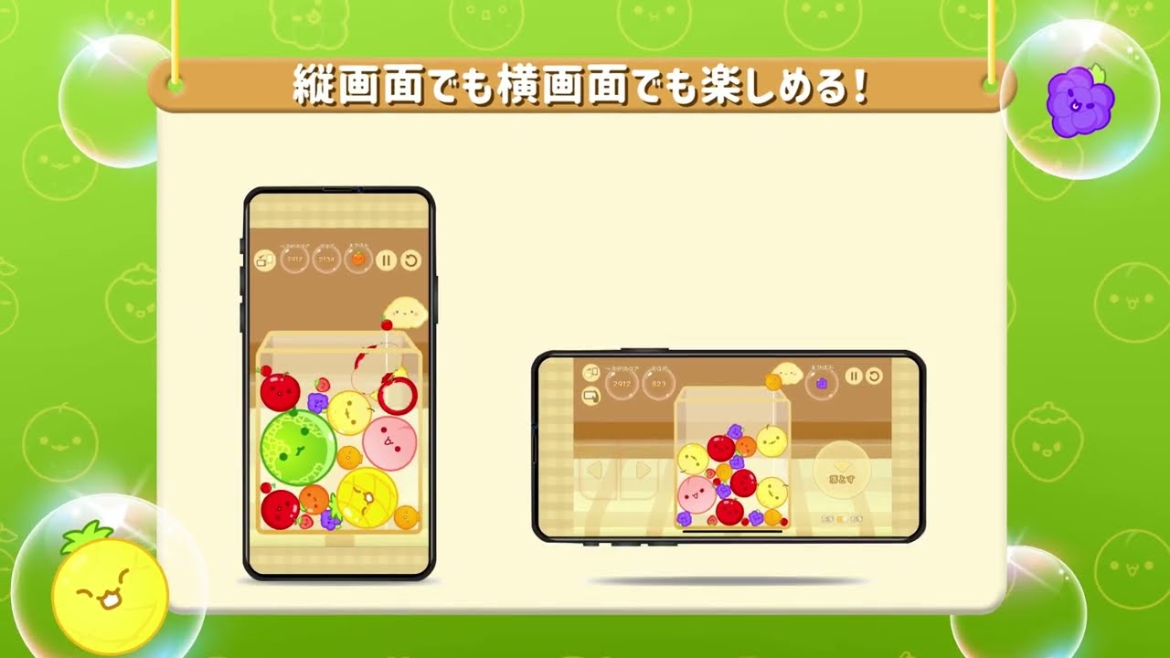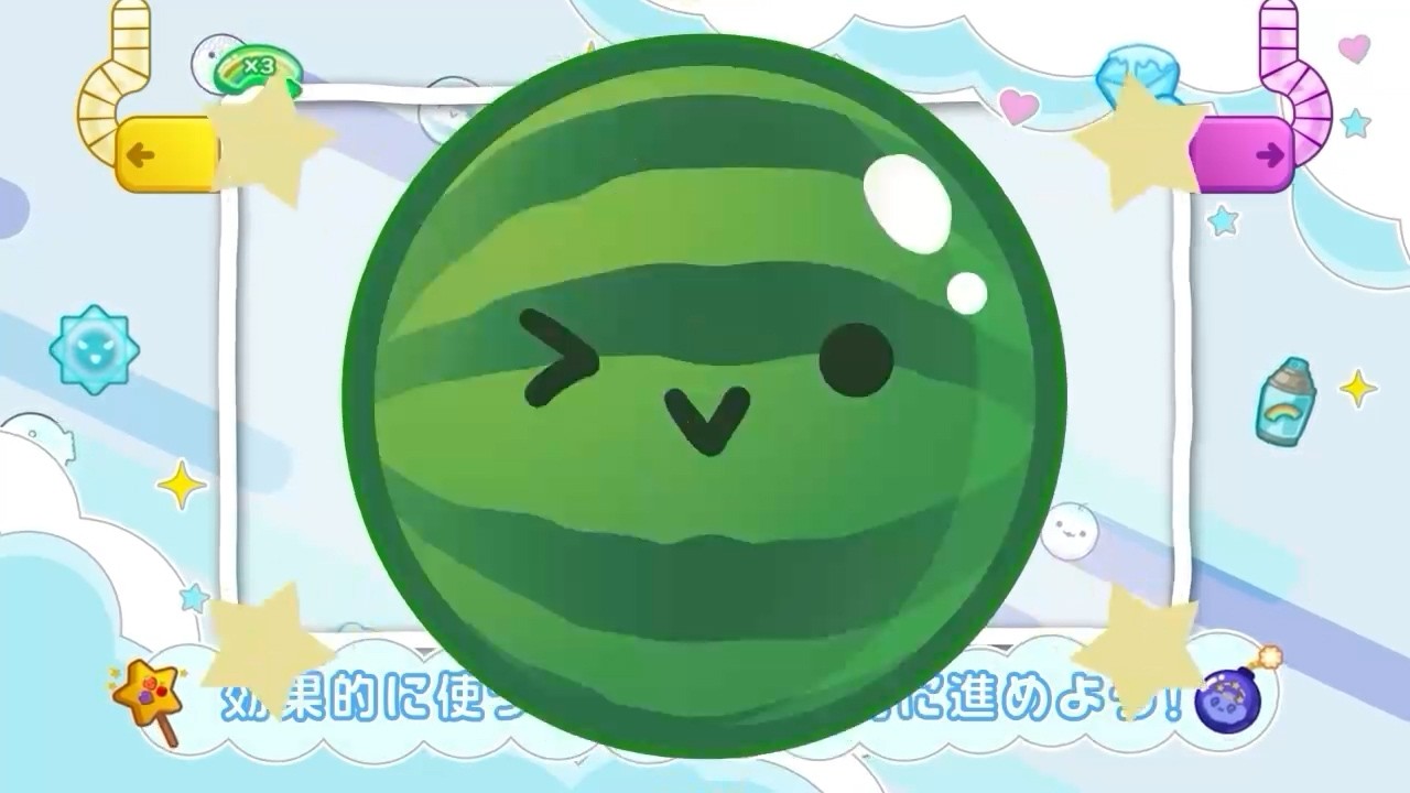 To prevent the fruits from overflowing from the box, collide the same kind of fruit. As you collide fruits, their types change. Let’s create big watermelons!